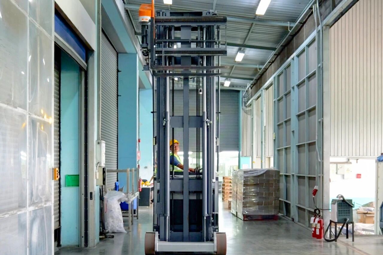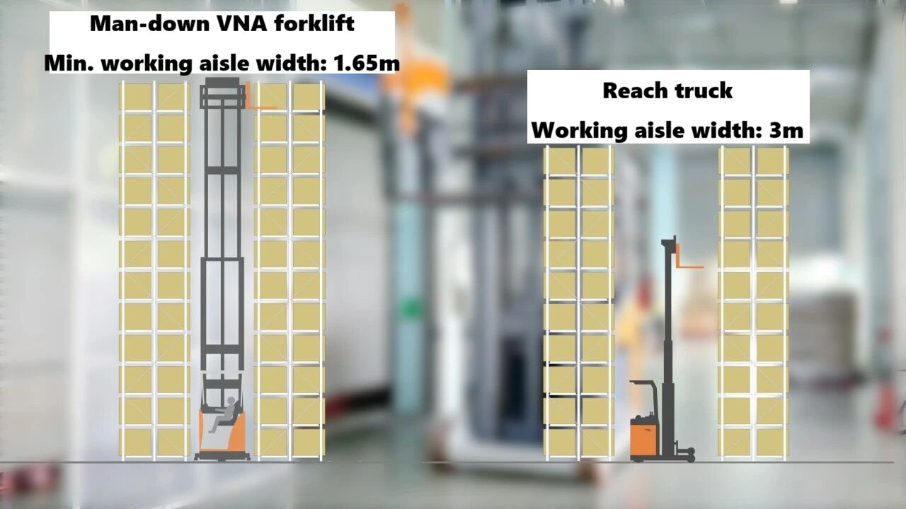 2) The 4 units of man-down seated type 3-way VNA forklifts are equipped with 3-way electric forks that can rotate 180°. This allows for loading, unloading, and stacking operations in three directions without the need to turn the vehicle in the aisle, greatly simplifying the operation process, reducing the time per operation, and improving the efficiency of order fulfillment.
