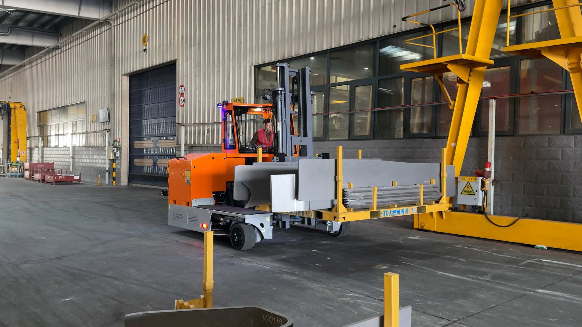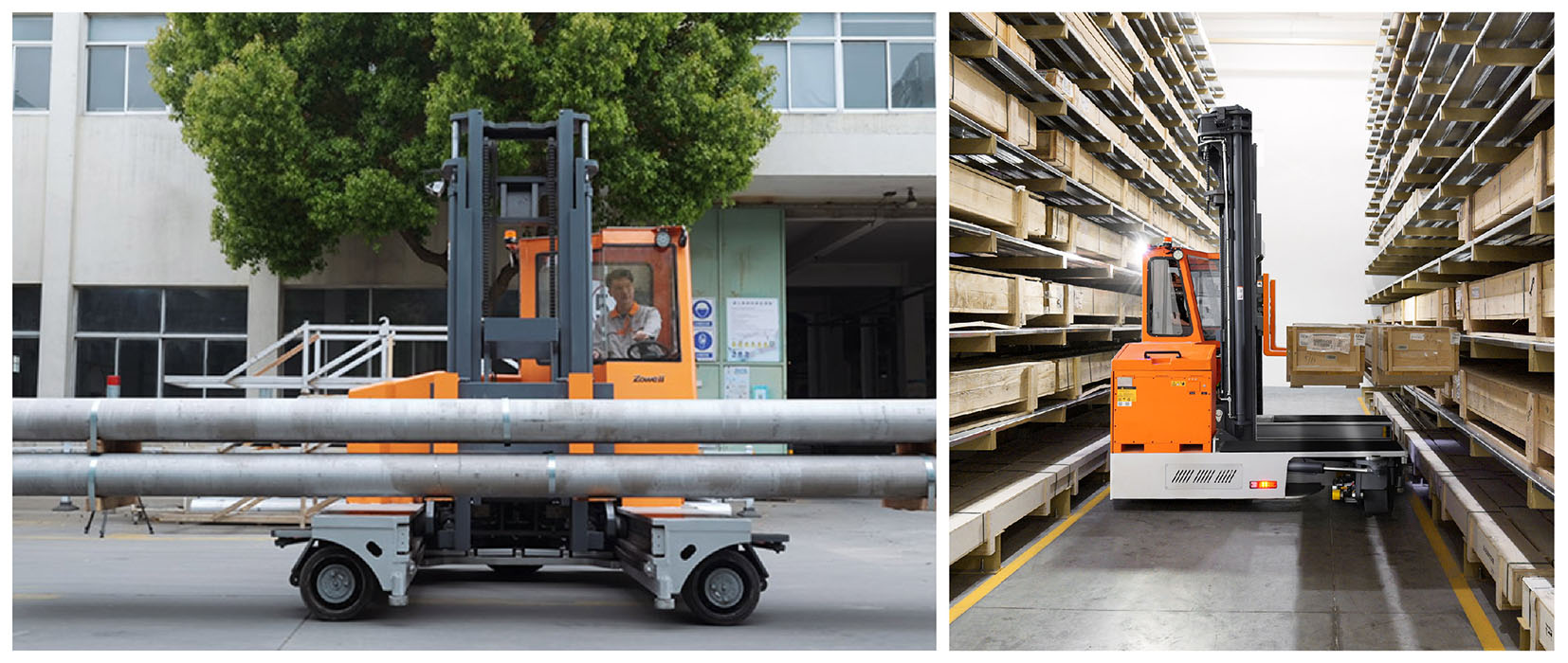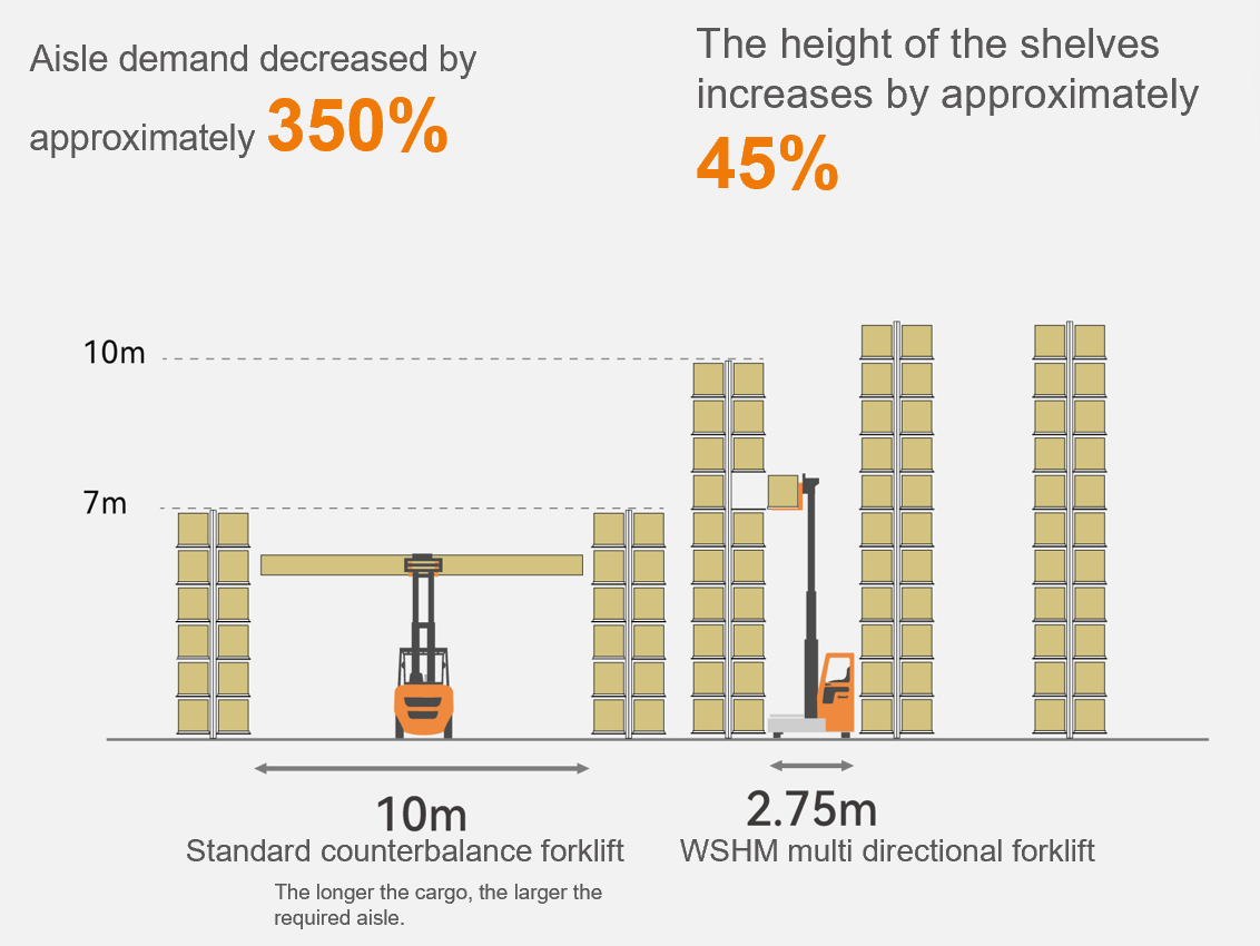 Zowel WSHM series electric multi-directional forklift is designed for handling of heavy-duty, bulky very long goods in a very narrow aisle.