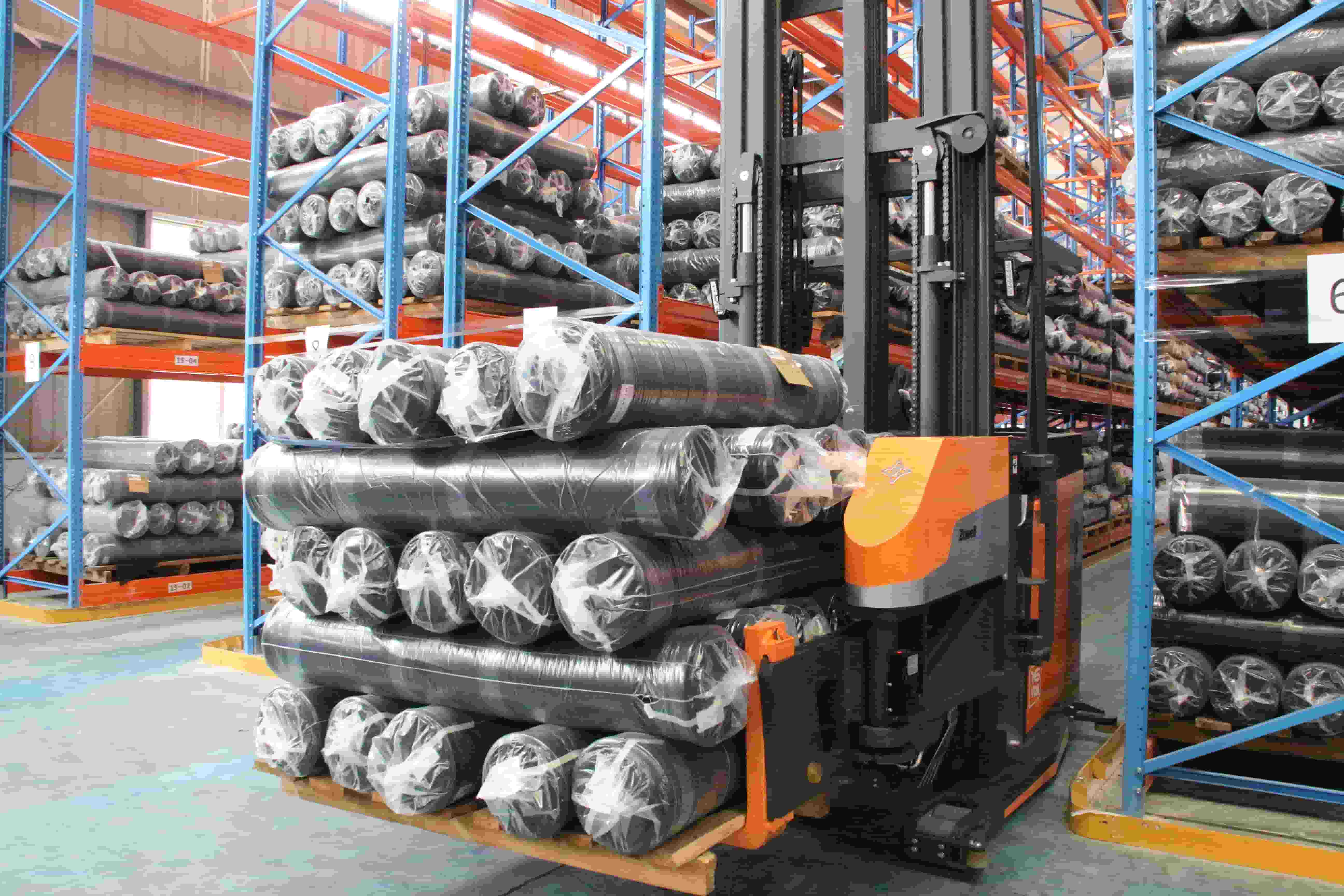 Zowell supplied the VDA series sit-down/stand-up VNA forklifts, designed specifically for narrow-aisle operations and high-density storage of textile materials.