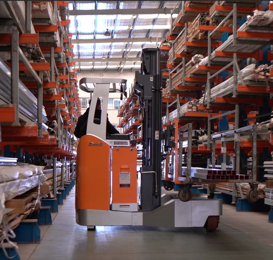 The RSEW series is a ride-on omni-directional reach forklift, ideal for narrow-aisle stacking and handling of long materials. Its 360° omni-directional steering allows full maneuverability, making it capable of replacing conventional reach forklifts.