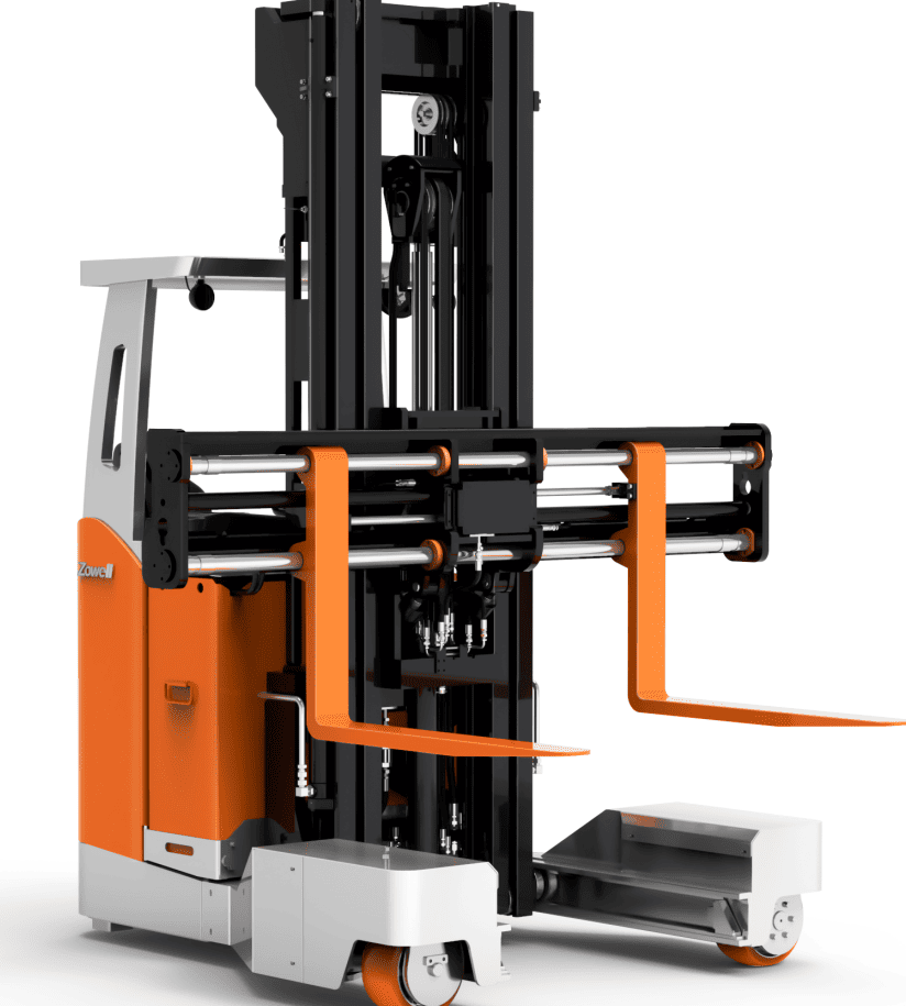 The Zowell WSHM Series is a ride-on multi-directional electric reach forklift designed for narrow aisles, heavy loads, oversized and long material handling.